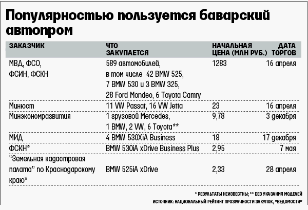 В некоторых ведомствах практикуют внутренние распоряжения, кому какой автомобиль положен, говорит гендиректор «Центра размещения государственного заказа» Александр Строганов: например, руководителю – BMW 7-й серии, его заместителям – 5-й серии, а начальникам департаментов или управлений – «японка». Российских машин в этих рекомендациях нет, замечает он.
