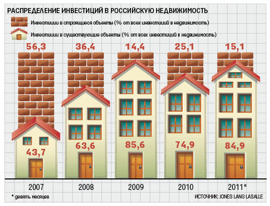 Общий объем инвестиций в коммерческую недвижимость в 2011 г., по данным Jones Lang LaSalle (JLL), составил $8,2 млрд. Это в 2 раза больше, чем в 2010 г. ($4,1 млрд), и почти вдвое больше, чем в самый успешный в российской истории 2008 год, когда было инвестировано $4,6 млрд. Другие консультанты согласны с выводами, но приводят немного иные цифры: по расчетам Colliers International, инвесторы в 2011 г. вложили около $10,3 млрд, из которых $7,6 млрд пришлось на Москву. Популярнее всего у инвесторов офисы и торговая недвижимость: по подсчетам JLL, в каждый из этих сегментов вложили по $3,3 млрд. Российская недвижимость популярна у иностранных инвесторов: в 2009–2010 гг. на их долю приходилось всего 16% вложений, а в 2011 г. – 35–40% (по разным оценкам).