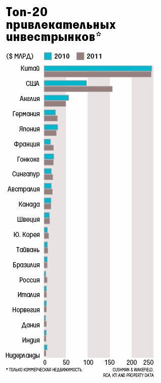 Стремление инвесторов найти стабильный рынок, который был бы хорошим убежищем для денег, – одна из главных тенденций. В конце февраля американская Hines, одна из крупнейших мировых инвестиционных компаний на рынке недвижимости (ее активы – более 1100 объектов на $23,7 млрд), объявила о планах вложить $1,6 млрд в Великобритании, чтобы диверсифицировать портфель после активных инвестиций в последние годы в Восточной Европе. «Мы хотим вложить деньги в более традиционные рынки, такие как лондонский и американский, чтобы дополнить инвестиции Hines в России и Восточной Европе», – заявил Росс Блэр, управляющий директор британского подразделения Hines. В прошлом году Hines купила в Москве бизнес-центр «Гоголевский» за $96,1 млн и складской комплекс в Химках за $70,8 млн, а сейчас завершает приобретение пяти зданий в странах Восточной Европы.