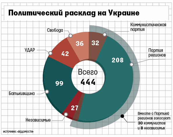 Движение Украины вперед невозможно без политического примирения, заявил вчера президент Виктор Янукович. По его мнению, есть «предпосылки для политического консенсуса» ради модернизации и продолжения реформ. Однако первые после осенних выборов голосования в парламенте показали, что оппозиция намерена блокировать инициативы президентской Партии регионов, которая в условиях отсутствия большинства голосов (208 из 450) пока проводит свои решения через парламент с трудом.