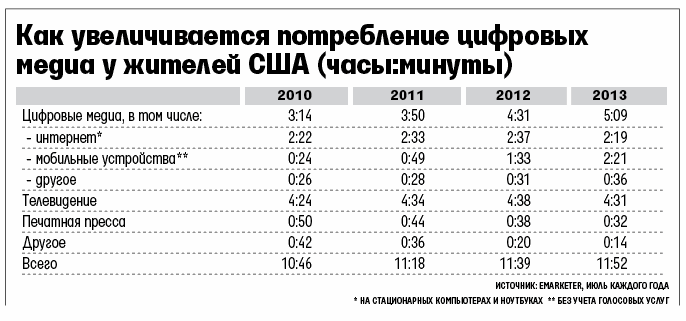 Большую часть цифрового контента американцы получают через мобильные устройства - планшеты и смартфоны. Теперь американцы пользуются ими в 1,5 раза дольше, чем год назад: 2 часа 21 минуту в день. В интернете на стационарных компьютерах и ноутбуках они проводят на 2 минуты меньше, и это время постепенно убывает.