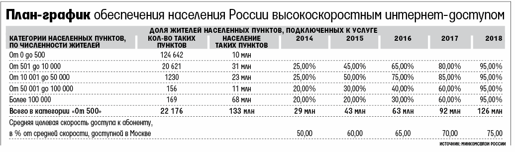 Чтобы к 2018 г. обеспечить населенные пункты с населением от 500 человек интернетом со средней скоростью доступа не менее 2 Мбит/с, потребуется 175 млрд руб., или почти $5,5 млрд, - таковы результаты подсчетов, проведенных большой четверкой операторов - «Мегафоном», МТС, «Вымпелкомом» и «Ростелекомом»; эти данные приводятся в презентации Минкомсвязи для правительства (есть у «Ведомостей»). Адекватность цифр подтвердили источники в нескольких операторах. По плану-графику из той же презентации предполагается, что к 2018 г. современной связью со средней скоростью интернет-доступа не менее 3/4 от средней скорости доступа в Москве будет обеспечено 95% жителей таких населенных пунктов (см. таблицу).