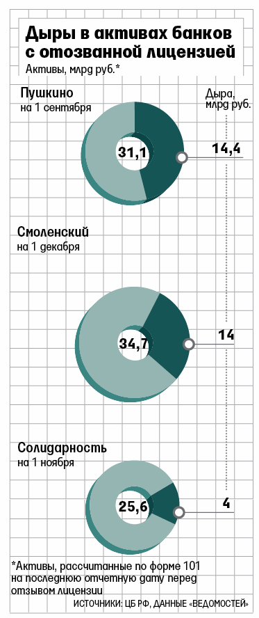 Как выяснили «Ведомости», Пробизнесбанку достается банк с дырой (разница между заявленной и реальной стоимостью активов) примерно в 4 млрд руб. Такие подсчеты регулятора назвал банкир, знакомый с положением в «Солидарности». Человек, близкий к ЦБ, подтвердил порядок цифр. По его словам, у «Солидарности» отрицательный капитал. По итогам III квартала у банка был капитал в 2,7 млрд руб. На 1 ноября активы «Солидарности», по данным банка, составляли 25,6 млрд руб., т. е. потенциальные потери по активам могут достигать 16%.
