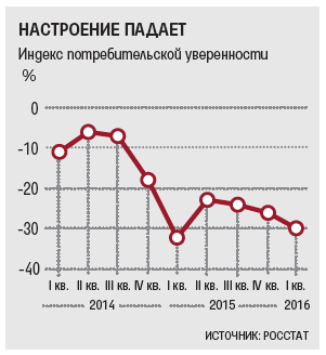 Уровень потребительской уверенности населения в I квартале снизился третий квартал подряд, следует из результатов обследования, проведенного Росстатом. Индекс снизился на 4 п. п. до минус 30% по сравнению с IV кварталом 2015 г. (см. график). Снижение обусловлено отрицательной динамикой большинства компонентов индекса – в первую очередь оценок населением изменений в экономике, отмечают в Росстате. Индекс ожидаемых изменений экономической ситуации на краткосрочную перспективу снизился на 4 п. п. до минус 19%, в следующие 12 месяцев положительных изменений ожидает 15% опрошенных (в IV квартале 2015 г. – 16%), негативных – 41% (37%). Интерфакс