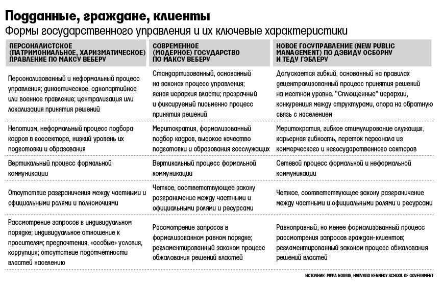 Если немного дополнить картину, то можно выделить три типа госуправления см. таблицу). Для ясности добавлю к ученой таблице, что при правлении первого типа население – это подданные. При правлении второго типа – граждане. В третьем случае граждане – это во многом клиенты (как у частной компании).