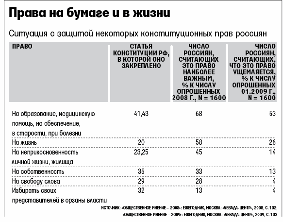 Следуя этой логике проведения параллелей между днями календаря и статьями Конституции, радикальные перемены могут произойти едва ли не в любой момент. Прав на бумаге у российских граждан много, но вот с их применением и защитой постоянные проблемы. Кандидатом на статус часа икс вполне может стать и 20-е число: право на жизнь и безопасность закреплено в 20-й статье Конституции. Его считают исключительно важным для себя почти две трети россиян – и в то же время почти треть чувствуют себя ущемленными в этом праве (см. таблицу). Или, например, 23-е и 25-е числа, символизирующие непростую ситуацию с реализацией россиянами прав на неприкосновенность личности и жилища. Практически невозможно придать календарное измерение сложностям с защитой других важных прав, например на бесплатное образование, медицинское обслуживание или на собственность. Григорианский календарь оказывается для них просто тесен.