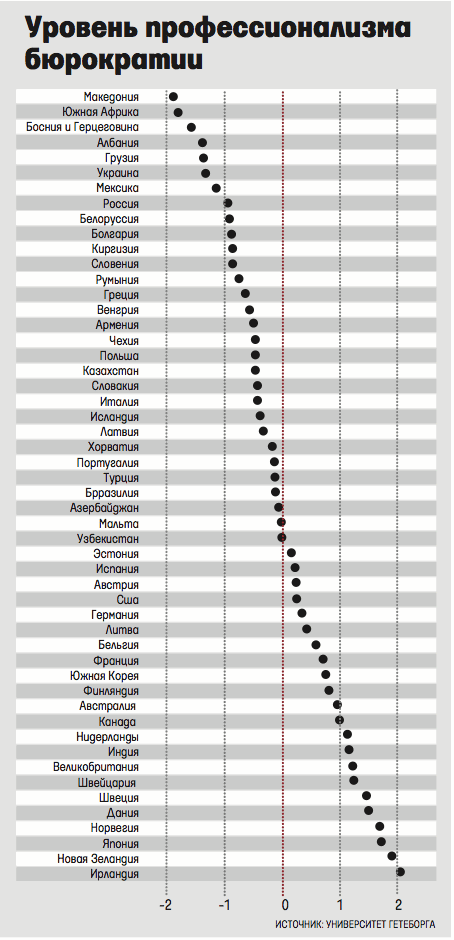 Самая большая часть государства – профессиональная бюрократия. Именно на нее в последнее время политологи и экономисты все пристальнее смотрят как на ключевую. Ян Теорелл, Карл Дальстрем и Виктор Лапуенте (Jan Teorell, Carl Dahlstrom, Victor Lapuente) из Университета Гётеборга в Швеции провели исследование бюрократии в 52 странах и обнаружили, что уровень коррупции и профессионализм бюрократии сильно связаны (статья «Бюрократия, политика и коррупция»).