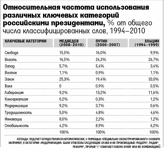 Анализу были подвергнуты стенограммы всех посланий российских президентов начиная с 1994 г. Борис Ельцин выступил с шестью посланиями, Владимир Путин – с восемью и Дмитрий Медведев – с тремя, включая последнее, прозвучавшее 30 ноября. В исследовании использовалась компьютерная программа для контент-анализа QDA Miner.