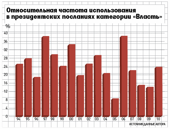 Среди наиболее часто встречающихся в текстах посланий трех президентов слов много совпадений. Например, все трое чаще других слов используют «власть», «Россия», «федерация», «государство», «наши», «люди», «должны» и их производные. Примечательно активное использование слова «должен»: лишь в 1996 г. (когда состоялись единственные, пожалуй, президентские выборы, исход которых не был очевиден заранее) его производные составили 0,1% от всех употребленных президентом слов, а вот в 2005 г. – почти процент. В последнем послании упор тоже делается на долженствовании (0,7%), а не на создании «возможностей» (0,2%) или защите «прав» (<0,05%). С точки зрения обладателей верховной власти, чиновники, бизнес, население – все «должны».