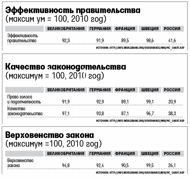 Тут, конечно, не грех вспомнить, что согласно Конституции (ст. 80, п. 3) президент Российской Федерации определяет основные направления внутренней и внешней политики государства. Таким образом, фактически в Основном законе России заложена крайне высокая вероятность самодержавного «ручного режима», который начинает сводить к минимуму возможности как исполнительной, так и законодательной ветвей власти влиять на принятие государственных решений. А заодно появляются противоречащие Конституции широкие возможности фактически подчинить президенту и судебную систему. Отсюда и столь низкая оценка России Всемирным банком по показателю «верховенство закона» (см. таблицу 3). Какой следует сделать вывод?