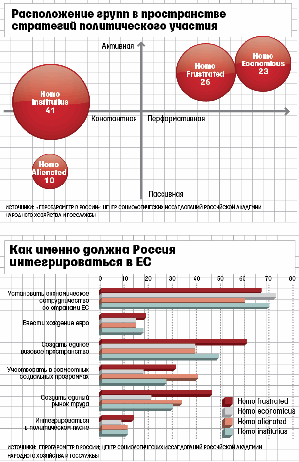 Таким образом, мы видим, что Homo Economicus и Homo Frustrated, которые чаще других стояли плечом к плечу на оппозиционных митингах, не совпадают во взглядах на сближение России с ЕС. Те, кто полагает, что им уже нечего терять, готовы к эмиграции и потому приветствуют слияние рынков труда. Самыми же последовательными интеграционистами оказываются представители Homo Institutius, которые довольны экономическим и политическим климатом в стране, но, напомним, в наименьшей степени хотят уехать за рубеж. При этом к политическому слиянию с Европой, похоже, никто из групп не готов. Возможно, те, кто поставил на стране крест, не видит в этом смысла, те же, кто надежд не теряет, еще дорожит тем, что считает независимостью.