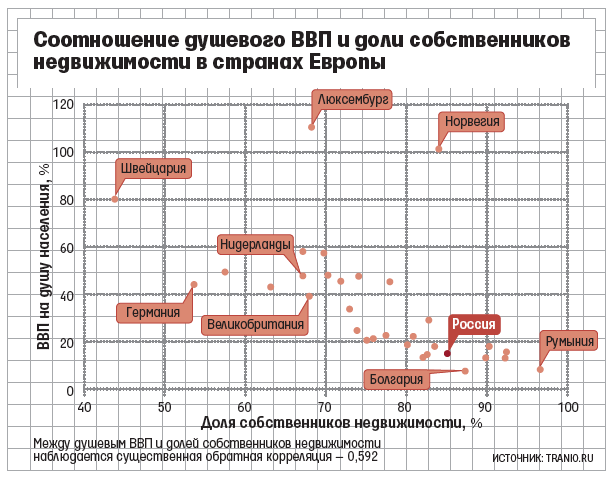 Однако, если мы посмотрим, как в Европе соотносится доля собственников недвижимости и ВВП на душу населения, мы увидим интересную картину - существенную обратную корреляцию между этими величинами. Чем страна богаче - тем меньше, оказывается, там собственников.