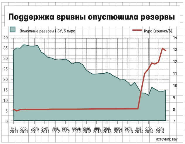 В стремлении «не пущать» Россия отнюдь не уникальна. Наиболее свежий и горячий пример - Украина. Стремление ее прежнего политического руководства обеспечить иллюзию того, что все идет по плану, а ситуация в стране и экономике стабильна и подконтрольна, привело к фиксации курса гривны по отношению к доллару. С июля 2012 г. официальный курс, и до того колебавшийся лишь минимально, был установлен на уровне 7,993 гривны за $1. Данное решение было принято на фоне постепенного снижения валютных резервов нацбанка.