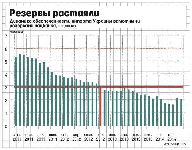 Но законы экономики действуют и против воли политиков. Со временем на Украине официальный курс стал заметно отличаться от рыночного, к моменту отмены фиксации к доллару в начале февраля 2014 г. разница составляла порядка 15%. На момент фиксации стоимости гривны к доллару обеспеченность импорта товаров и услуг резервами находилась на уровне примерно 3,4 месяца, почти вдвое ниже нижней границы относительного комфорта. Так что затея с фиксированием курса изначально была абсолютно авантюрной. Неудивительно, что и красная черта трехмесячного покрытия импорта резервами была пройдена всего через три месяца после фиксации курса.
