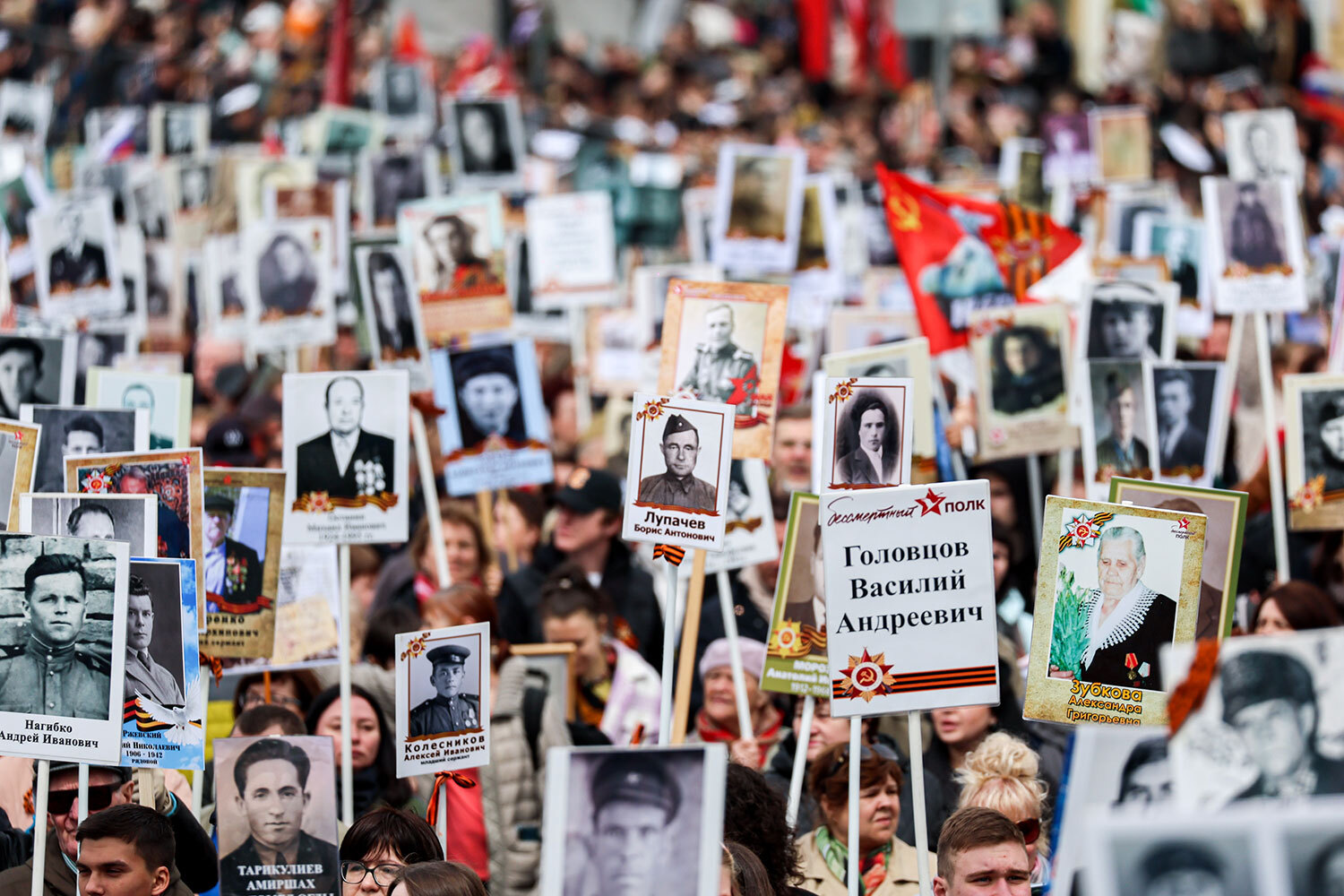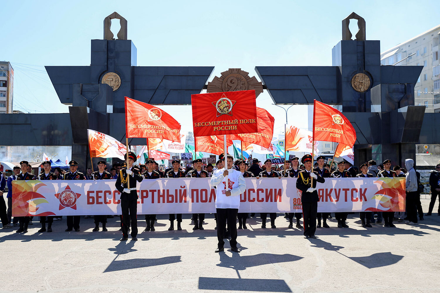 Республика Саха (Якутия). Якутск. Участники акции памяти «Бессмертный полк» во время шествия в День Победы.