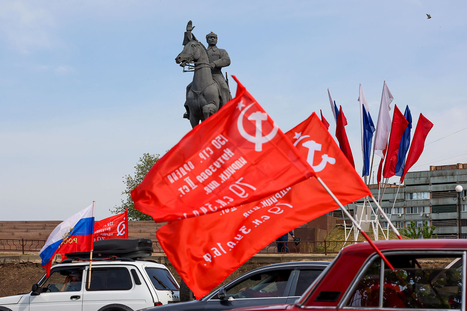 Луганск. Участники автопробега, посвященного 80-й годовщине Победы в Великой Отечественной войне, у памятника Клименту Ворошилову на улице города.