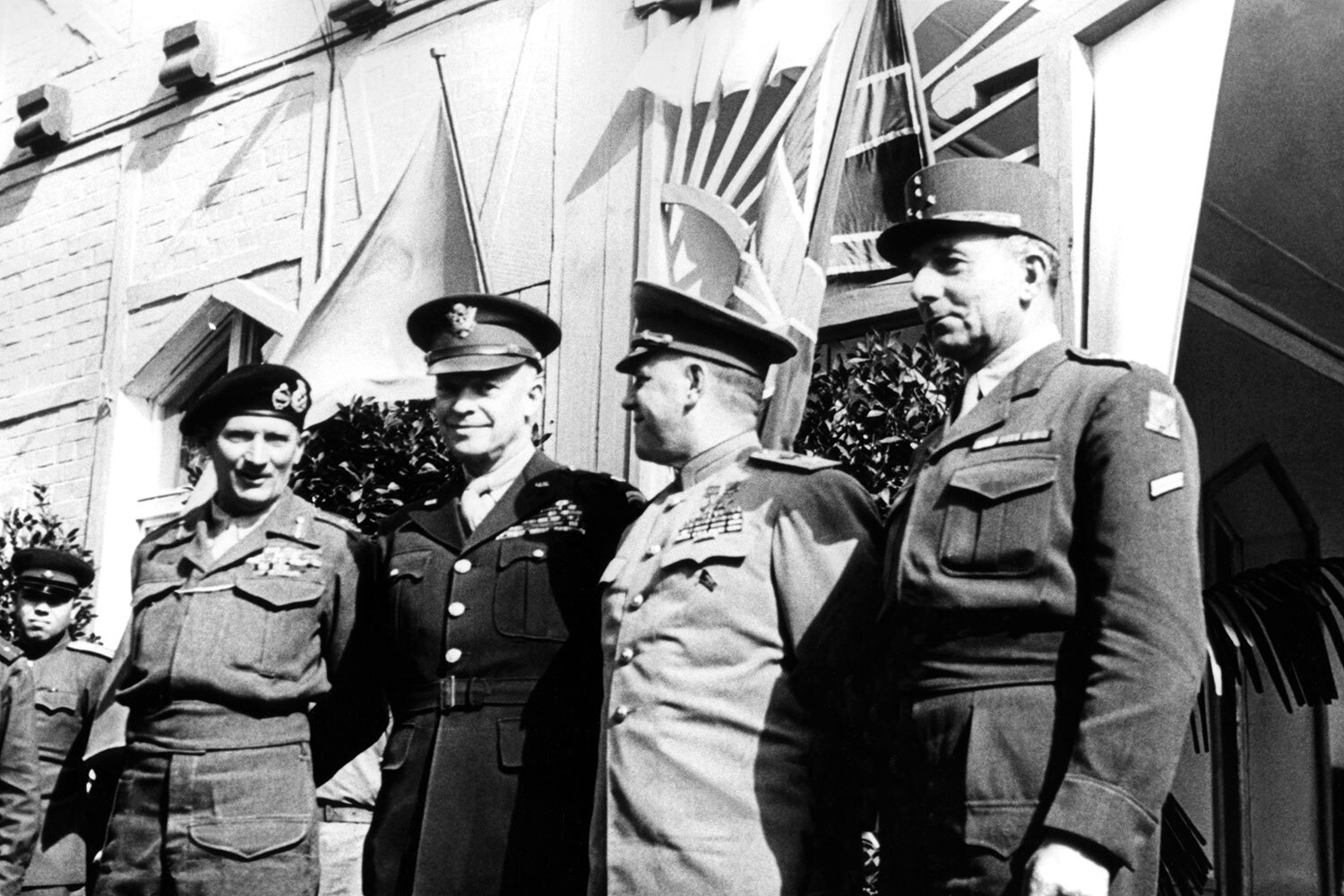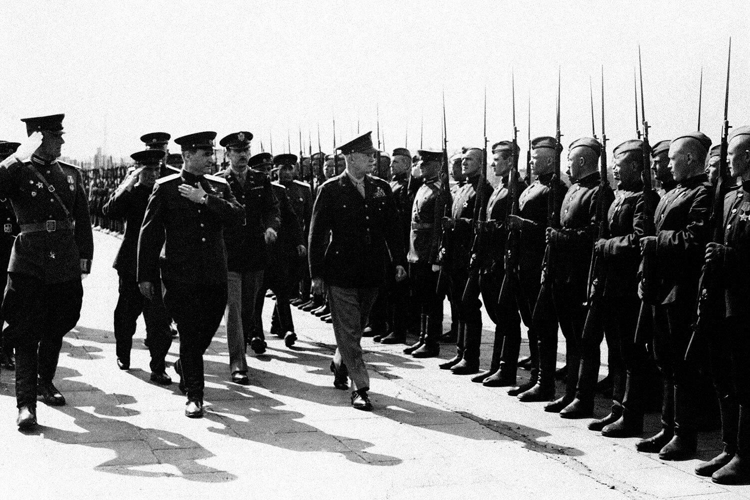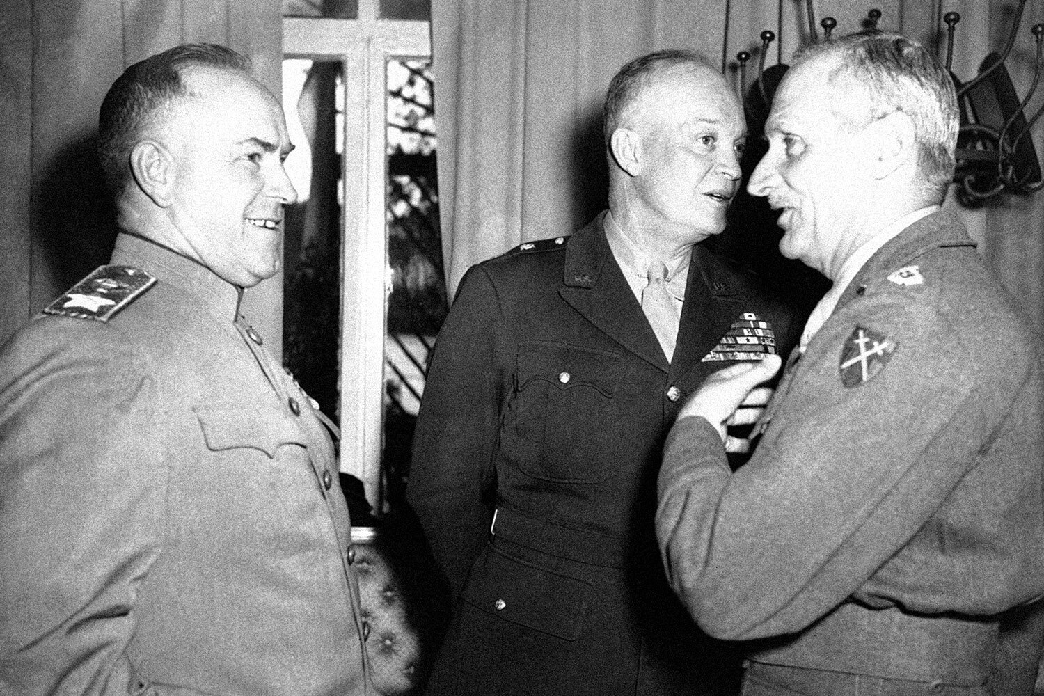 На фото: маршал Георгий Жуков (слева), фельдмаршал Бернардо Монтгомери (справа) и генерал Дуайт Эйзенхауэр