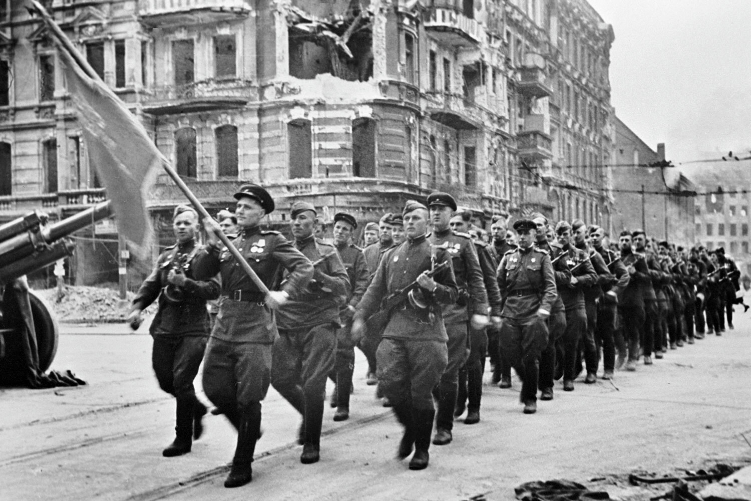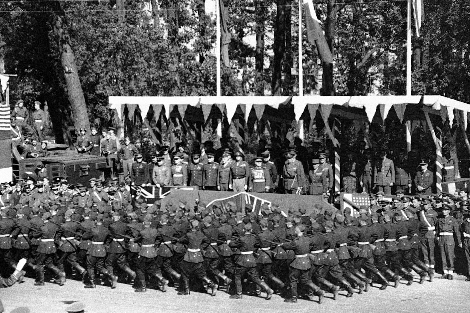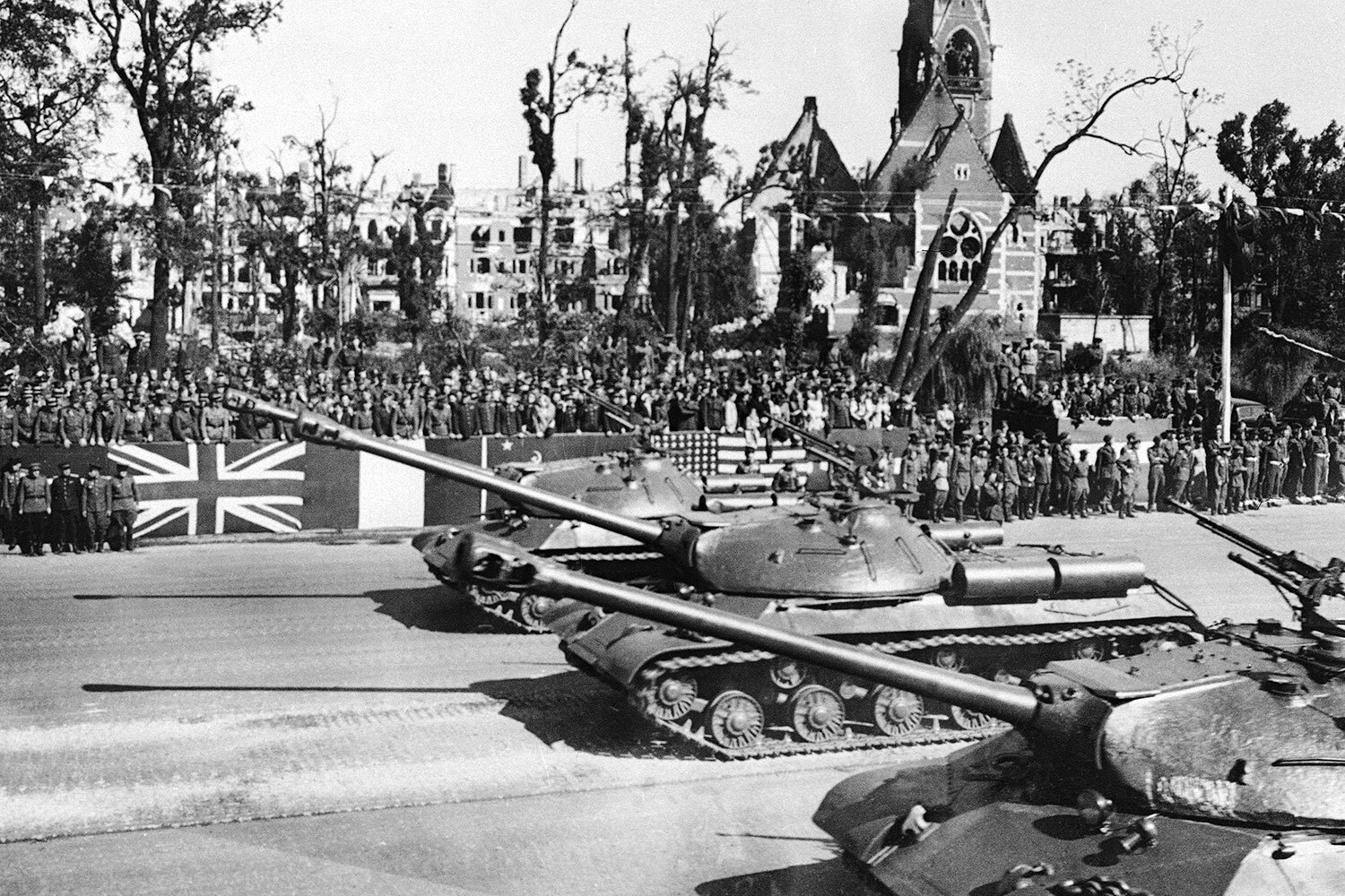 Евгений Тиханов / РИА НовостиПо улицам Берлина маршировали советские штурмовые отряды, французские партизаны, альпийские стрелки, американские воздушные десантники, рассыпной строй английской пехоты. Колоннами прошли танки ИС-3, А34 Comet и M24 Chaffee, самоходки Sexton, бронемашины Daimler Mk II и М8 Greyhound.