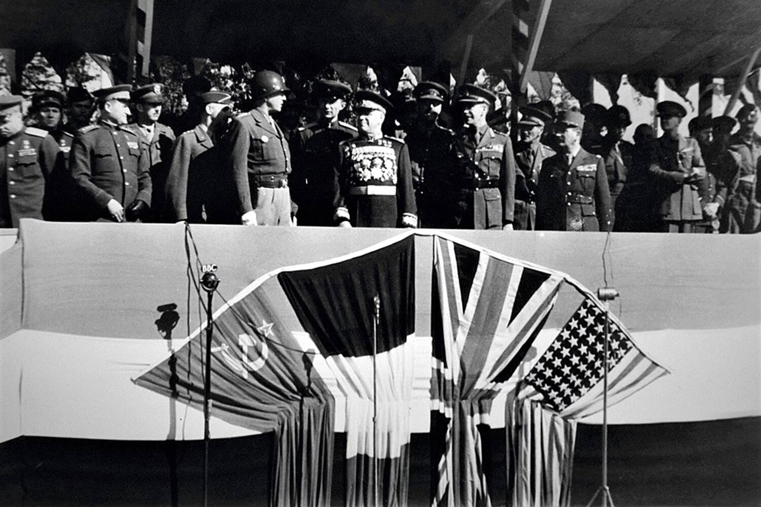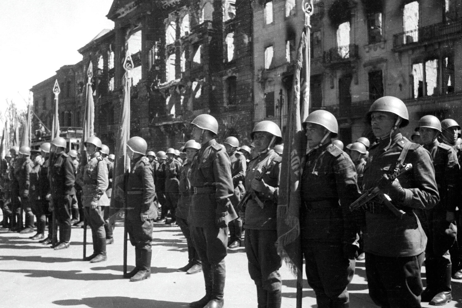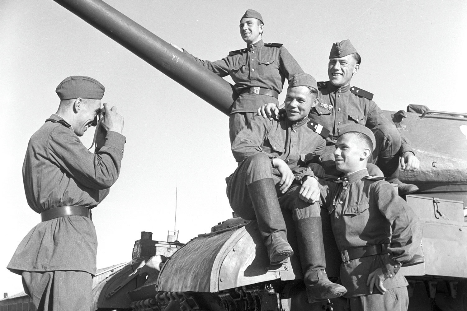 Евгений Тиханов / РИА НовостиПо улицам Берлина маршировали советские штурмовые отряды, французские партизаны, альпийские стрелки, американские воздушные десантники, рассыпной строй английской пехоты. Колоннами прошли танки ИС-3, А34 Comet и M24 Chaffee, самоходки Sexton, бронемашины Daimler Mk II и М8 Greyhound.