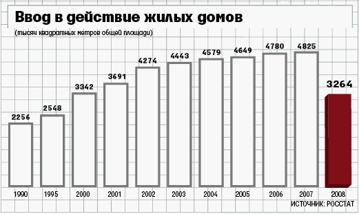 Первый заместитель мэра Юрий Росляк говорил в интервью «Ведомостям», что больше всего от кризиса пострадала инвестиционная деятельность, тем не менее Москва продолжает строить жилье по городскому заказу. По словам руководителя столичного стройкомплекса Владимира Ресина, в нынешнем году на территории города планируется построить и ввести в эксплуатацию 3,1 млн кв. м жилья (из них 1 млн кв. м – для очередников). Это на 5% меньше, чем было введено в 2008 г. (см. график).