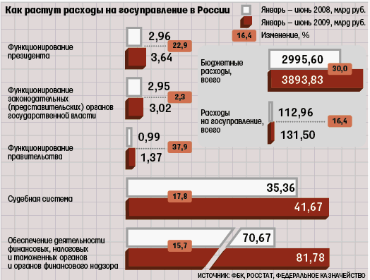 Однако, по данным ФБК, расходы по статье на госуправление выросли на федеральном уровне на 16,4% до 131,5 млрд руб. «Кудрин говорил о затратах на содержание министерств и ведомств, а мы считали расходы на содержание президента, аппарата правительства, судов», – объясняет различие Игорь Николаев из ФБК. Расходы на функционирование президента выросли на 22% (до 3,65 млрд руб.), аппарата правительства – на 37,9% (до 1,4 млрд руб.), судебной власти – на 17,8% (до 4,1 млрд руб.).