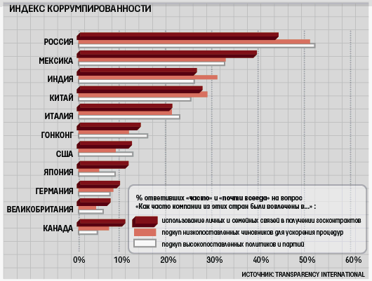 Коррумпированные чиновники и политики в развивающихся странах, в числе которых и Россия, ежегодно получают $20–40 млрд взяток, подсчитали в Transparency International. Коррумпированность в России, по оценке организации, на уровне Бангладеш, Кении и Сирии: 147-е место из 180. Российские компании часто прибегают к подкупу высокопоставленных политиков и чиновников, уверена половина респондентов Transparency International.