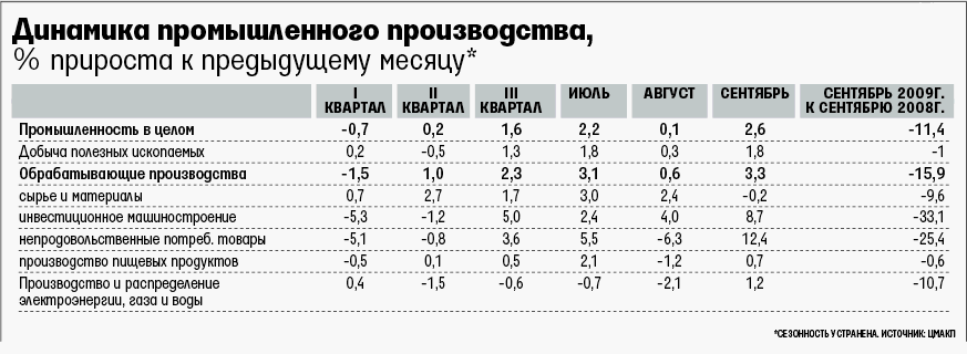 В сентябре промышленность взяла реванш: темпы ее восстановления в сравнении с августом резко ускорились. В сравнении с сентябрем-2008 выпуск был меньше на 9,5%, это минимальное сокращение с декабря прошлого года