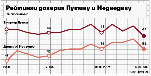 Две социологические службы зафиксировали снижение рейтинга и президента Медведева, и премьер-министра Путина. Виноваты выборы, считают социологиОчередной еженедельный опрос фонда «Общественное мнение» (ФОМ) о доверии россиян к лидерам страны (24–25 октября; 2000 респондентов в 44 регионах) показал падение рейтингов президента Дмитрия Медведева и премьера Владимира Путина. Уровень доверия к Медведеву 18 октября был наибольшим за время его президентства – 62%, упал до 56%; выросла – с 11% до 14% – доля тех, кто ему не доверяет. Рейтинг Путина упал с 72% до 66% и достиг минимума с момента, когда он возглавил правительство. (Ниже рейтинг Путина был только весной 2007 г., когда он работал еще президентом.) Максимального значения достигло и недоверие к премьеру – 12% (было 9%). На 4 процентных пункта упала доля тех, кто считает, что Медведев и Путин хорошо справляются. На 4 п. п., до 53%, упал рейтинг «Единой России», на 2 п. п., до 10%, вырос рейтинг КПРФ.
