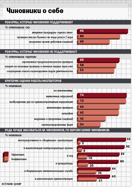 Главным сюрпризом для проводивших опрос стало неожиданно большое число чиновников, не знающих базовых положений законов, говорит научный руководитель ЦЭФИР Екатерина Журавская. 56% респондентов не знают, в какой срок можно отказать в выдаче лицензии, 51% – максимальную продолжительность проверки, 34% – минимальный срок действия лицензии, 21% неправильно ответили на вопрос о возможности изъятия документов в ходе проверок. «Законы о регулировании исполняются плохо не только потому, что чиновники не хотят [их выполнять], но и потому, что не могут и не знают», – делает вывод Журавская. Причина – недостаточный уровень образования и отсутствие контроля знаний меняющейся законодательной базы, считает старший экономист ЦЭФИР Наталья Волчкова: «ЕГЭ чиновникам бы не помешал».