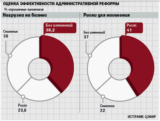 Три четверти опрошенных чиновников в целом одобряют снижение административных барьеров и дебюрократизацию, хотя поддерживают не все элементы реформы (см. инфографику). Но ни бизнесу, ни самим чиновникам от реформы легче не стало, выяснил ЦЭФИР. Административная нагрузка на бизнес не изменилась или даже возросла, считает 62% респондентов, конфликтов между компаниями и госорганами меньше не стало, но при этом растет уровень ответственности чиновников и трудоемкость их работы. Более трети считают, что реформа ничего не изменила и в жизни общества, а 41% убеждены, что снижение административных барьеров для бизнеса увеличило риски для населения.