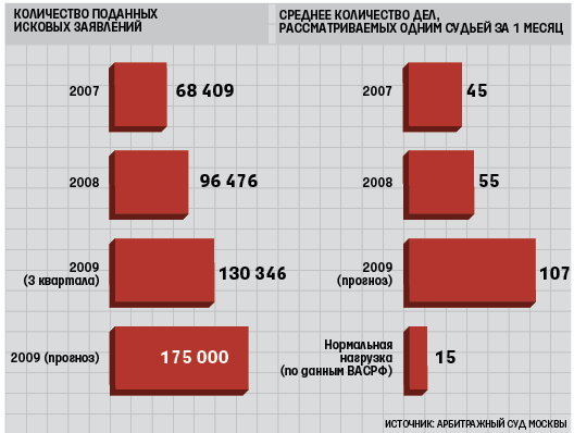 В 2009 г. число исков, поданных в Арбитражный суд Москвы, вырастет вдвое: с 96 500 в 2008 г. до 175 000 – такой прогноз сделал во вторник его председатель. К 15 декабря уже было подано 167 000 исков, сообщил он. При этом ежедневно в суд поступает 1000 заявлений и даже больше. По данным судебной статистики, основной рост нагрузки приходится на конец 2008 – 2009 г., т. е совпадает с наступлением кризиса.