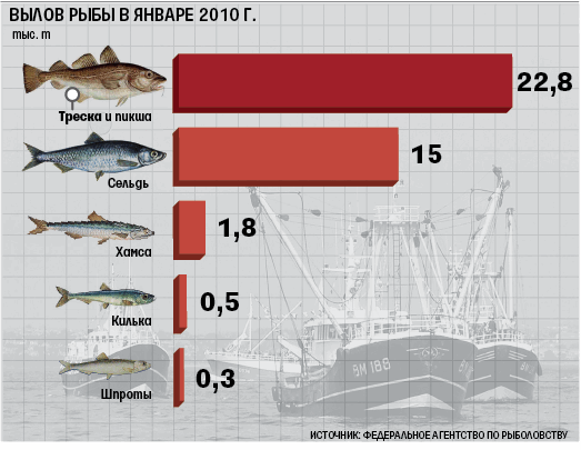 Вылов рыбы в России с начала года увеличился на 23% до 311 000 т – но пока рост привел только к затовариванию складов на Дальнем Востоке и падению цен, сообщило Росрыболовство. По словам представителя ведомства, дальневосточные компании не могут реализовать около 20 000 т сельди (общий вылов в январе на Дальнем Востоке – 15 000 т, кроме того, на складах хранятся прошлогодние остатки) и десятки тысяч тонн минтая (вылов – 179 000 т с начала года). Хранить минтай уже негде, говорит он, в холодильниках осталось место лишь для 8000–10 000 т рыбы. Стоимость минтая снизилась до 30 руб. за 1 кг (с примерно 50 руб. в конце 2009 г.), на сельдь – до 17,5 руб. (с 25 руб.), говорит он.