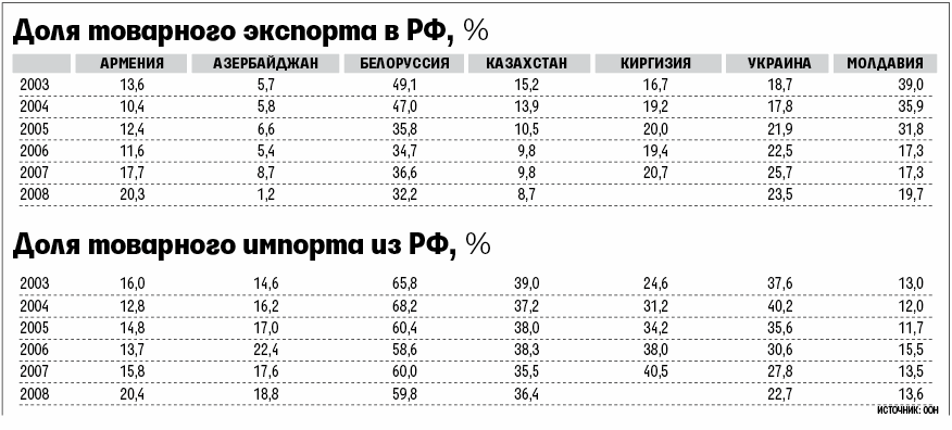 Традиционно считалось, что существует очень сильная связь между Россией и СНГ, прежде всего по торговым потокам, говорит главный экономист Сбербанка Ксения Юдаева, но за последние 10 лет доля России в экспорте четырех из семи стран СНГ заметно сократилась. Больше других от этой торговли зависит Белоруссия, треть экспорта которой сейчас идет в Россию, но 10 лет назад эта доля составляла 50%. По данным ООН, Молдавия в 2000 г. отправляла в Россию 45% экспорта, в 2008 г. – 20%, Казахстан – 20% и 9% соответственно; доля Армении и Украины не снизилась, но и не выросла (около 15% и 23% соответственно).