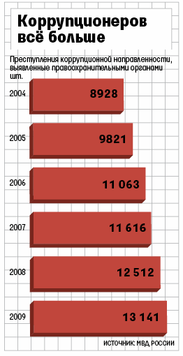 Этот процесс начался – за первые два месяца 2010 г. число коррупционных преступлений, зарегистрированных правоохранительными органами, снизилось на 7% в сравнении с тем же периодом 2009 г. Более важная задача, по мнению Назарова, – снижение ущерба от коррупции и предотвращение предпосылок к ней. Если просто механически сажать выявляемых взяточников, не борясь с причинами коррупции, то такая борьба может длиться десятилетиями, не принося ничего обществу, уверен генерал.