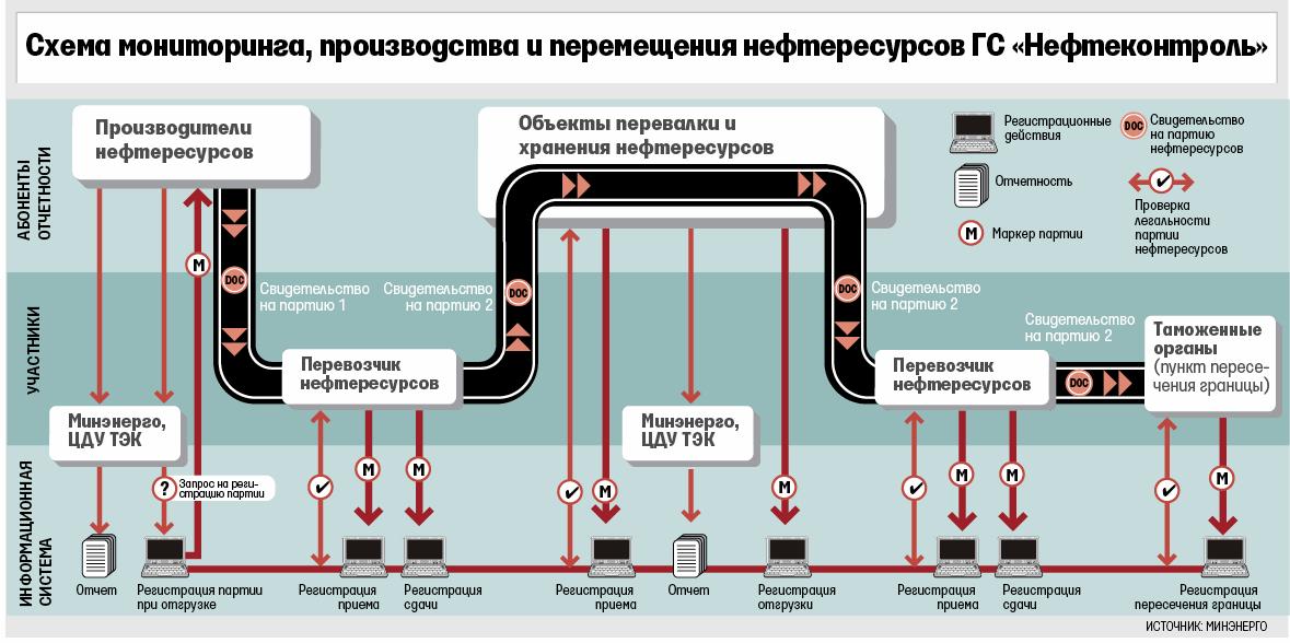 Цель «Нефтеконтроля» – обеспечить получение «достоверной» и «оперативной» информации о производстве и перемещении нефти и продуктов переработки как внутри страны, так и при поставках на экспорт, говорится в презентации. Это, по мнению чиновников, поможет повысить прозрачность рынка нефтересурсов, устранить с него «недобросовестных производителей и поставщиков», сократить теневой оборот и тем самым увеличить поступления в бюджет. Для того чтобы такая система заработала, Минэнерго предлагает объединить «информационные ресурсы» сразу семи ведомств (самого министерства, ФТС, Минтранса, ФНС, Ростехнадзора, Роснедр и Росстата), а к ним добавить данные о перевозках, которые собирают ЦДУ ТЭК, «Транснефть», «Транснефтепродукт» и РЖД. Правда, для этого всем участникам будущей системы еще предстоит «гармонизировать» действующие классификаторы нефтересурсов (сейчас они различаются в зависимости от целей классификации) и согласовать методики их учета, говорится в презентации.