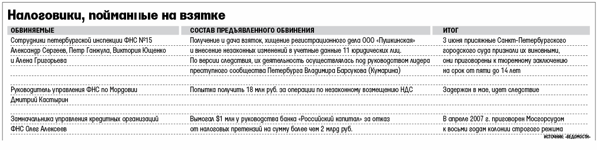 По исследованию, проведенному фондом «Индем» в 2005 г., налоговое ведомство оказалось лидером по уровню коррупционной нагрузки на бизнес: в среднем 700 опрошенным компаниям приходилось платить 3,3 взятки в год. С тех пор ситуация поменялась не сильно, но существенно вырос средний размер взяток, отмечает президент «Индема» Георгий Сатаров. В год возбуждается несколько десятков существенных дел о коррупции в налоговых органах (по данным Генпрокуратуры, всего в 2009 г. зарегистрировано 7856 фактов получения взятки. – «Ведомости»), говорит представитель департамента экономической безопасности МВД. По его словам, в них фигурируют и крупные чиновники: так, в апреле арестован по подозрению в получении взятки руководитель управления ФНС по Мордовии Дмитрий Кастырин.