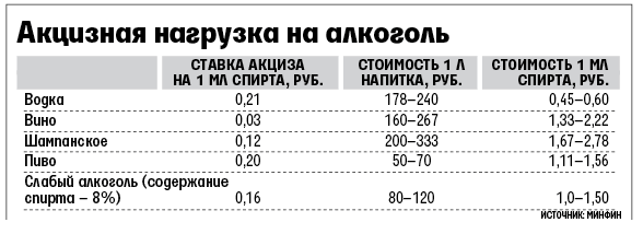«Водка должна стоить дорого – это не товар первой необходимости», – говорил замминистра финансов Сергей Шаталов; государство, повышая цену на водку, «не хочет проводить политику спаивания». Сейчас водка – один из самых доступных алкогольных напитков, в том числе из-за низкий стоимости спирта для нее, говорит чиновник ведомства, участвующего в обсуждении вопроса (см. таблицу). Но резкий рост цен мог бы привести к негативным социальным последствиям, объясняет Песков отказ от повышения акцизов, выросла бы и доля контрафактной продукции. Индексация акцизов в 2011–2013 гг. будет превышать инфляцию, но скорее всего останется в рамках 10%, сказал чиновник Минэкономразвития.
