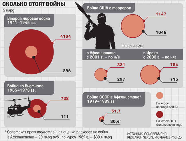 Для сравнения: СССР потратил на войну в Афганистане согласно письму ЦК КПСС членам партии от 1988 г. примерно 50 млрд руб., что по официальному курсу составляет около $57 млрд в нынешних ценах. Это примерно в 6 раз меньше, чем на войну в Афганистане потратили за сопоставимый срок США, не считая расходов их союзников.