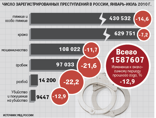 Как говорится в размещенных на сайте МВД данных о состоянии преступности в январе – июле 2010 г., количество зарегистрированных убийств за этот период сократилось в сравнении с аналогичным периодом 2009 г. на 14,2% до 9447, а умышленных причинений тяжкого вреда здоровью – на 10,6% до 23 332. Количество зарегистрированных разбоев за тот же период упало на 22,2% до 14 200, грабежей – на 21,6% до 97 033, а наиболее массового преступления – краж – на 7,2% до 629 751 случая. Общее же количество зарегистрированных преступлений упало до 1 587 607 (т. е. на 12,9%).