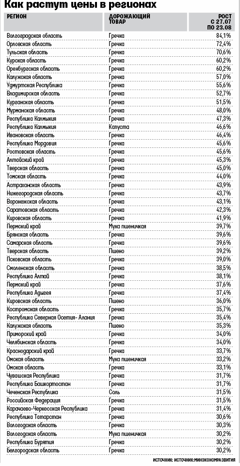 По состоянию на 23 августа регулирование цен потенциально может быть введено в 45 регионах, следует из подготовленного Минэкономразвития мониторинга продовольственных рынков (копия есть у «Ведомостей»). Большинство из них подвели цены на гречневую крупу (см. таблицу). Сильнее всего она подорожала в Волгоградской области – за четыре недели (с 26 июля по 23 августа) на 84,1%, а с начала года – на 204,3%. Похожая ситуация в Орловской, Тульской, Курской и Оренбургской областях. В Калужской, Кировской и Тверской областях более чем на 30% подскочили цены на пшено, в Омской и Вологодской – на муку, в Калмыкии – на белокочанную капусту, а в Чечне – на соль.