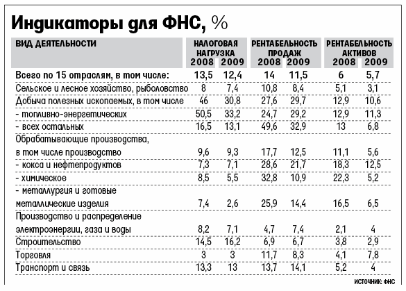 Больше всего рентабельность упала в химической промышленности, считает ФНС: по продажам – с 32,8 до 10,9%, по активам – с 22,3 до 5,2%. А выросла – у рыболовов: с 8,8 до 21,4%. Минимальная рентабельность была в 2009 г. у производителей транспортных средств и оборудования – 1,2% (4,4% в 2008 г.), максимальная – в сфере «добычи полезных ископаемых, кроме топливно-энергетических»: 32,9% (49,6%). Самая высокая нагрузка – у компаний, добывающих топливно-энергетические полезные ископаемые, – 33,2% (50,5% в 2008 г.), наименьшей – в оптовой торговле: сохранилась на уровне 2,2%.