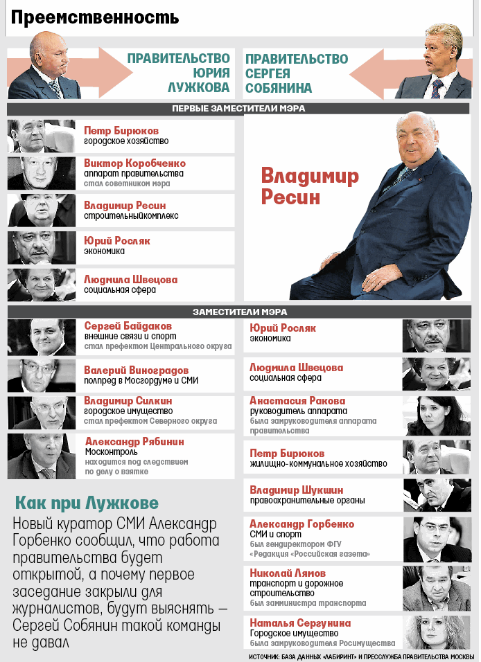 Вчера Собянин впервые в новой роли мэра провел заседание правительства Москвы и объявил о назначениях на уровне вице-мэров. Если у Лужкова было пять первых и четыре простых заместителя (см. инфографику), то теперь при сохранении общего числа замов будет лишь один первый вице-мэр – Владимир Ресин. Как рассказывал «Ведомостям» чиновник правительства, сохранение поста гарантировал Ресину лично премьер Владимир Путин на встрече 30 сентября.