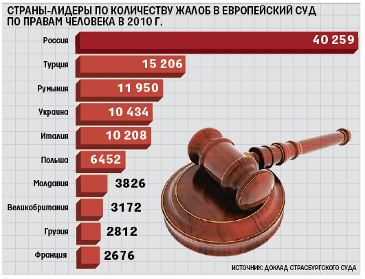 Россия по-прежнему лидирует по числу жалоб в Европейский суд по правам человека (ЕСПЧ), это следует из его ежегодного итогового доклада, который опубликован на сайте суда. К концу 2010 г. число обращений из России составило треть (28,9%) всех дел, поступивших в суд (40 295 жалоб).