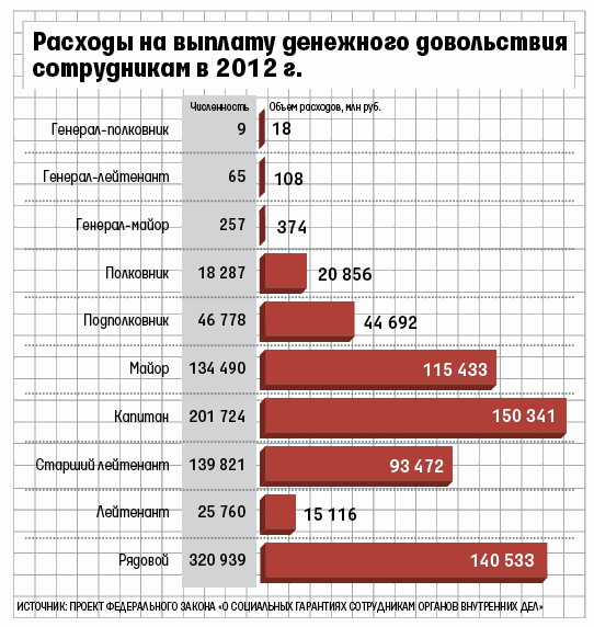 Меньших расходов потребует дополнительное обеспечение сотрудников МВД жильем за счет нового законопроекта. В финансово-экономическом обосновании говорится, что для этого в 2012 г. надо всего 12,78 млрд руб. В общей же сумме на решение жилищных вопросов сотрудников МВД в соответствии с новым законом надо 151 млрд руб., которые будут, как говорится в документе, изысканы поэтапно начиная с 2012 г. исходя из возможностей бюджета. Это означает, что обязательства по жилью, вытекающие из нового законопроекта, не получается реализовать сразу же – их выполнение растянется, сказал сотрудник МВД.