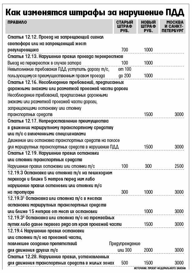 Сейчас размер штрафов по всей России за нарушения ПДД одинаков: за проезд на красный свет – 700 руб., за нарушения правил движения на перекрестках – 100–200 руб., за остановку на пешеходном переходе – 300 руб. Теперь будет разница: для всей России штрафы вырастут до 1000 руб. за большинство нарушений, а в двух городах федерального значения, Москве и Петербурге, – до 3000 руб. (подробности см. в таблице на стр. 02).