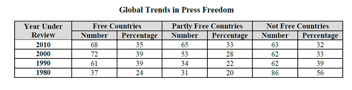 Только один из шести жителей планеты имеет доступ к свободной прессе, заключают в очередном обзоре правозащитники Freedom House. Это худший за последние десять лет показатель, констатируют они. Из 196 стран свободные СМИ существуют в 68 (35% от общего числа), частично свободна пресса в 65 (33%), несвободна в 63 (32%) признает Freedom House в опубликованном сегодня докладе Freedom of the Press 2011: A Global Survey of Media Independence