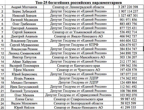 Сенатор от Ленинградской области, председатель комитета по делам СНГ, основатель и основной бенефициар строительной группы ЛСР Андрей Молчанов задекларировал за 2010 г. самый высокий доход (3,3 млрд руб., в 2009 г. было 2,7 млн руб.) среди чиновников и парламентариев, обязанных раскрывать свои доходы.