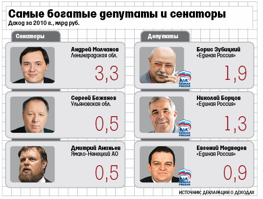 В прошлом году Зубицкий заработал 423 млн руб., в рейтинге Forbes за 2010 г. он поделил со своим сыном 97–98-е места (состояние каждого оценивалось в 700 млн руб.). Помощник народного избранника отказался комментировать возросшие доходы депутата. Борцов с доходом 813,7 млн руб. в прошлом году был четвертым в списке богатейших депутатов. Человек, близкий к Борцову, предполагал, что средства могли поступить из наследства от умершего в октябре сына («Финанс» в 2009 г. оценил состояние Юрия Борцова в $510 млн).