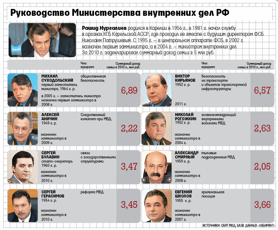 Близкий к Кремлю источник знает, что с заместителями министра сюрпризов и не должно было быть, увольняют в основном региональных руководителей. Их личные дела и другие материалы были подготовлены губернаторами и спецслужбами, а поступившие в Кремль докладные оказались неожиданными даже для министра Рашида Нургалиева, заявившего в Думе, что во время переаттестации всплыли проблемы «зарубежной недвижимости и другие вопросы».