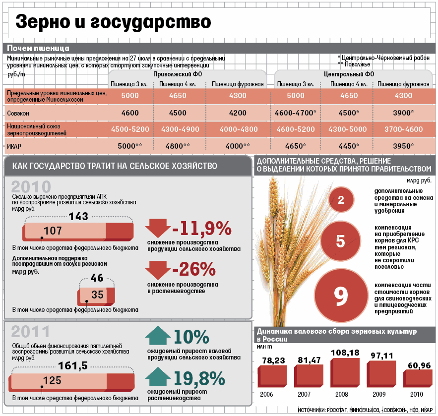 Производители зерна Центральной России и Поволжья боятся, что не выживут. Внутрироссийская цена на зерно уже ниже минимума, с которого должны начинаться государственные закупочные интервенции, но их не будет до сентябряЦены на зерно в Поволжье и Центральном Черноземье падают две недели подряд, делится наблюдениями гендиректор «Прозерно» Владимир Петриченко. Исполнительный директор аналитического центра «Совэкон» Андрей Сизов считает, что тенденция к понижению цены возникла еще раньше – в конце июня.